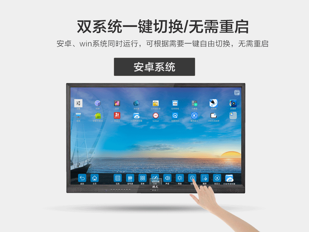 十點觸控,非常穩定,會議白板,無線投屏,遠程協作,主板采用安卓工控主板和X86工控主板,安裝win7或者win10 系統。